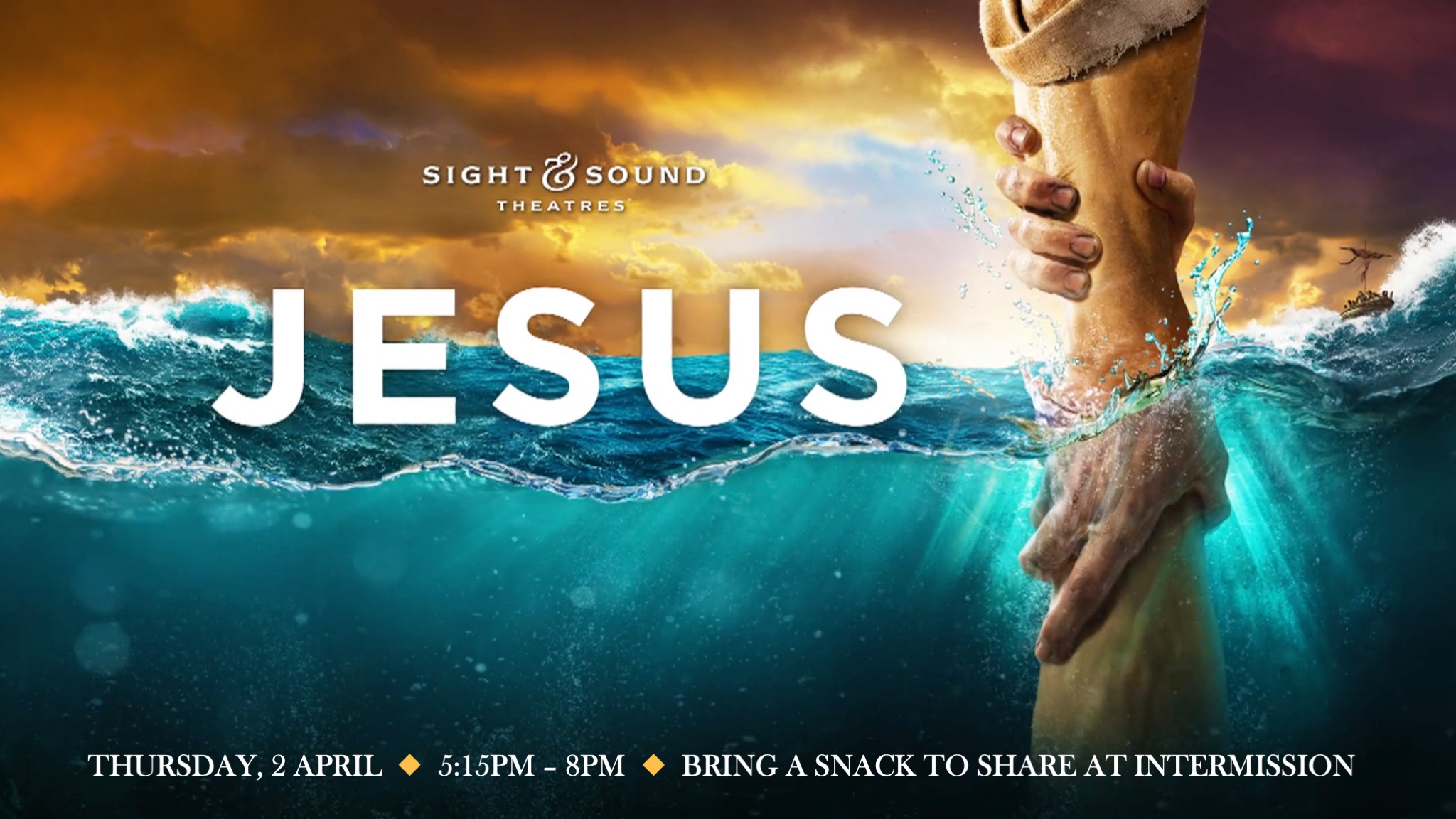 Jesus - live on screen – Filmed in front of a live audience, Sight & Sound’s JESUS is a state-of-the-art theatrical production. Witness some of the most awe-inspiring, miraculous events in the gospels as Jesus sets sail with fishermen, challenges the Pharisees, and heals the hurting. From the bustling streets of Jerusalem to the raging Sea of Galilee, experience the greatest rescue story of all time as it comes to life like never before!